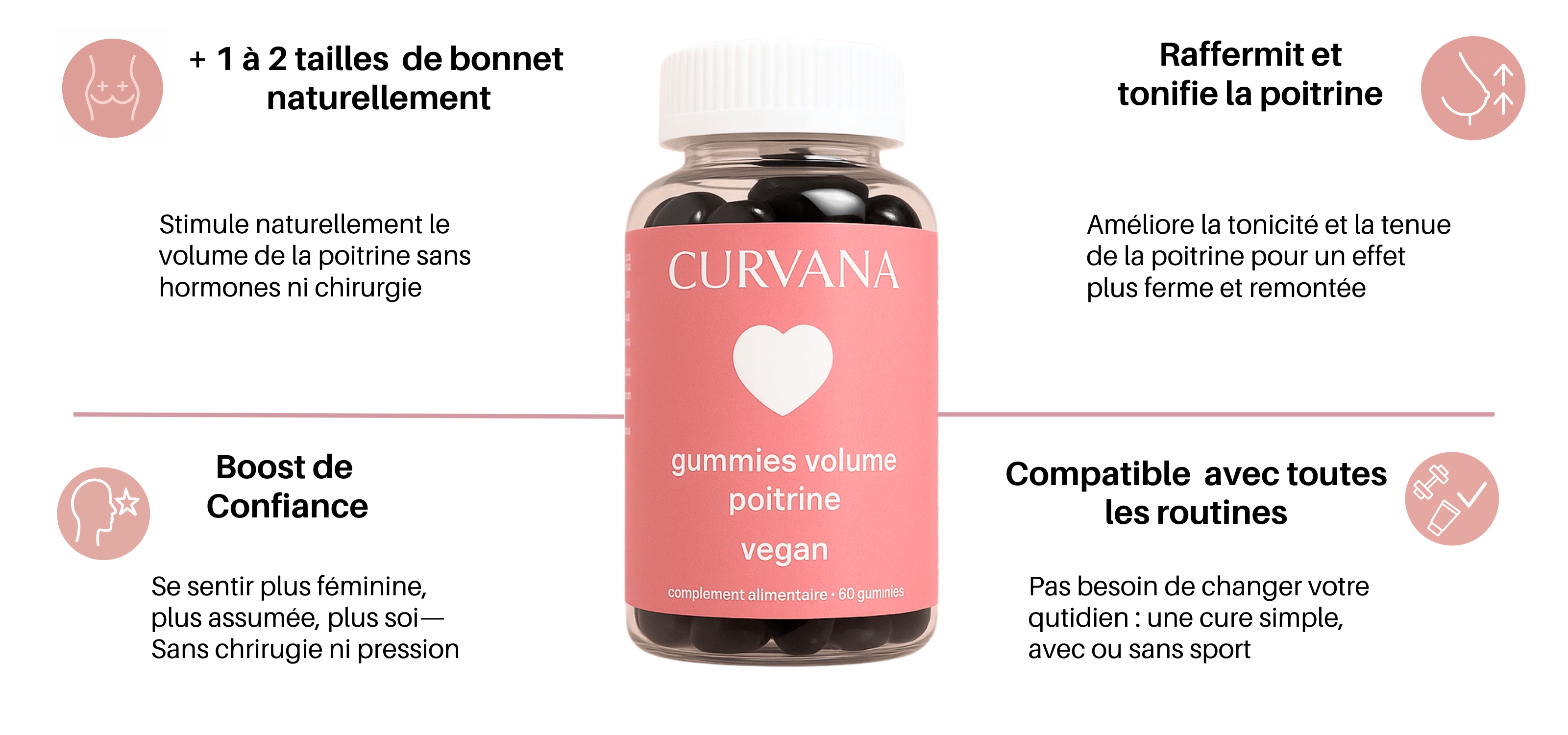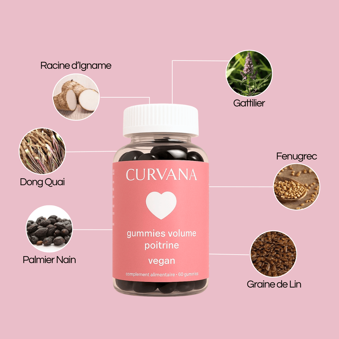 The power of Curvana Volume Poitrine gummies lies in their exclusive combination of targeted plant-based active ingredients, known to firm, shape and naturally increase breast volume.